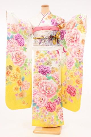 104-L-kaw0154 振袖レンタル Lサイズ 白地に黄色/楽園の宴 振袖 ~13号 お客様:M..