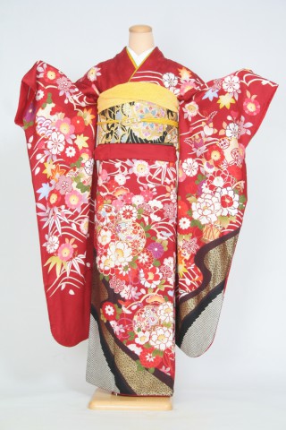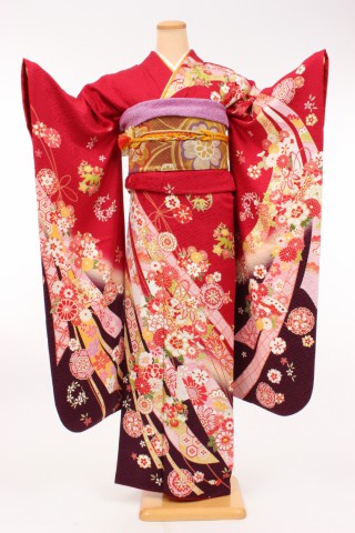 104-M-kaw0058 振袖レンタル Mサイズ 赤/吉祥熨斗目文 お客様:N.O様 茨城県 ..