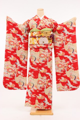 104-M-gaw0015 振袖レンタル Mサイズ 朱色/花模様に御所車と鶴 お客様:T.A様 神奈..