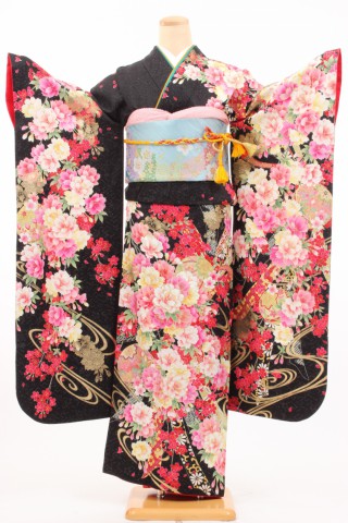 104-M-kaw0075 振袖レンタル Mサイズ 黒/流水に豪華華尽し お客様:N.A様 福島..
