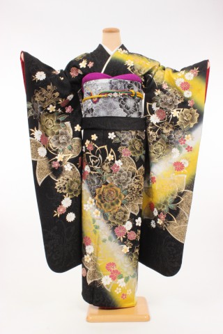 104-L-kaw0168 振袖レンタル Lサイズ 黒地黄ぼかし/金薔薇 お客様:H.M様 富山..