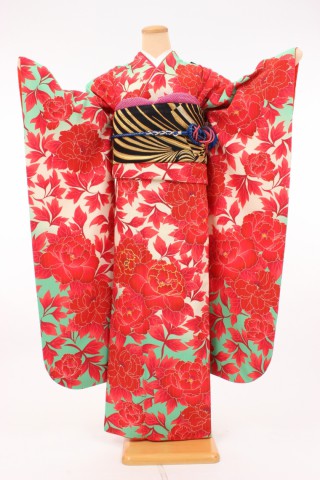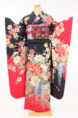 104-L-kaw0180 振袖レンタル Lサイズ 黒赤/百花繚乱/きもの道楽 お客様:E.E..
