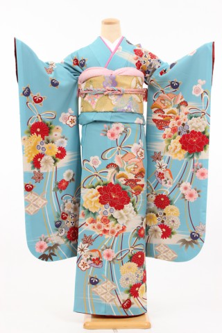 104-M-gaw0069 振袖レンタル Mサイズ 水色/花球に結び紐/きもの道楽 お客様:M.T様..