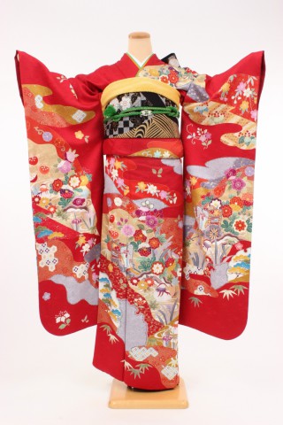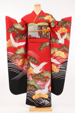 104-LL-kaw0040 振袖レンタル LLサイズ 赤/波に松と鶴 お客様:Y.U様 北海道..