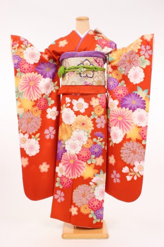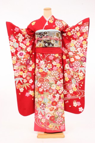 104-L-kaw0171 振袖レンタル Lサイズ 赤/雪輪に花流水 お客様:M.M様 新潟県 ..
