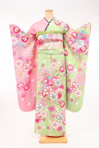 104-M-kaw0055 振袖レンタル Mサイズ ピンクに黄緑/花薬玉 お客様:K.N様 大..