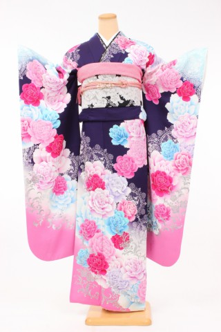 104-M-kaw0062 振袖レンタル Mサイズ 紺地にピンク/装飾模様に薔薇 お客様:C.T様 ..