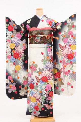 104-M-kaw0010 振袖レンタル Mサイズ 白黒ぼかし/折鶴舞 お客様:M.N様 三重県..