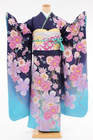 104-LL-kaw0053 振袖レンタル LLサイズ 紺ぼかし/結び紐に桜 お客様:S.M様 ..