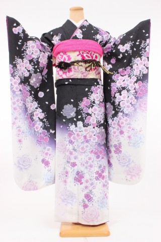 104-L-kaw0167 振袖レンタル Lサイズ 黒地/バラ色 お客様:A.K様 福岡県 2..