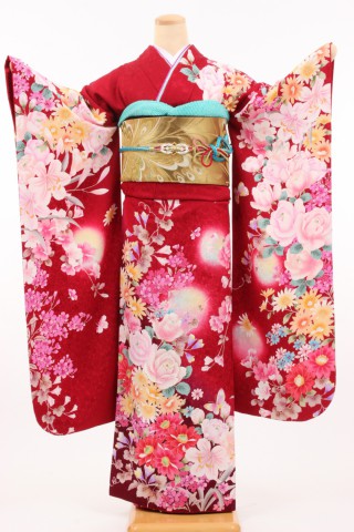 104-M-kaw0073 振袖レンタル Mサイズ 赤/水玉ボカシに草花文様 お客様:S.K様 静岡..