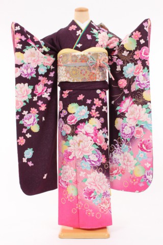 104-M-gaw0002 振袖レンタル Mサイズ 黒地に白ボカシ/紫花模様 お客様:H.O様 埼玉..