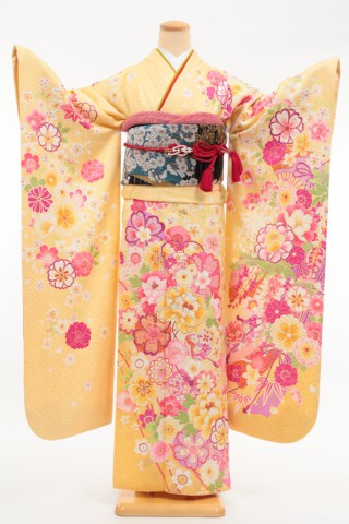 104-0181 振袖 新品レンタル 黄/結び紐に桜 お客様:M.I様 東京都 20代 ■和楽庵..