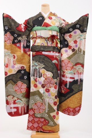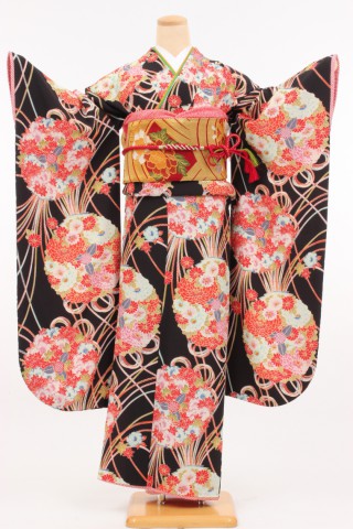 104-M-gaw0037 振袖レンタル Mサイズ 黒/薬玉/きもの道楽 お客様:M.Y様 埼..