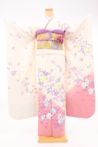 104-L-kaw0201 振袖レンタル Lサイズ 白地にピンク/花模様 お客様:M.I様 三..