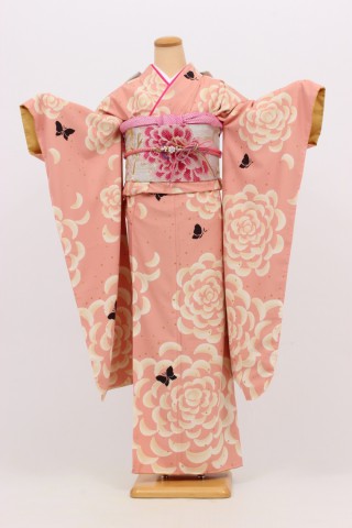 104-M-gaw0136 振袖レンタル Mサイズ ピンク/大バラに蝶/ツモリチサト お客様:..