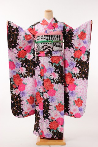 104-M-gaw0093 振袖レンタル Mサイズ 黒地/桜リングに花模様(パープル)/H・L(アッ..