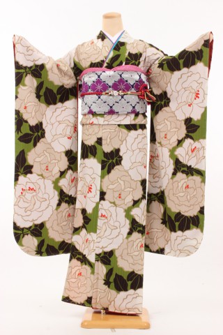 104-M-gaw0183 振袖レンタル Mサイズ 緑に白/大薔薇/和風館 お客様:M.H様 ..