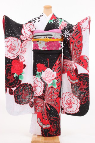 104-M-gaw0194 振袖レンタル Mサイズ 黒白/蝶の誘い/Rumi K(キクチルミ) ..