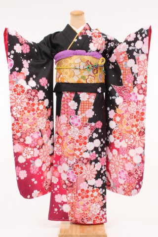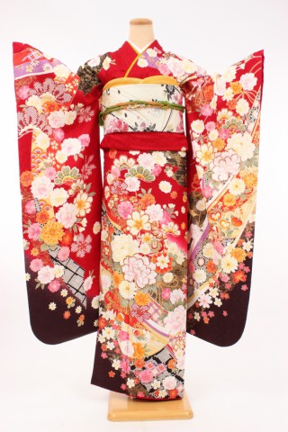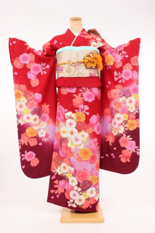 104-M-kaw0005 振袖レンタル Mサイズ 赤に裾グレーボカシ/花模様 お客様:M.O..