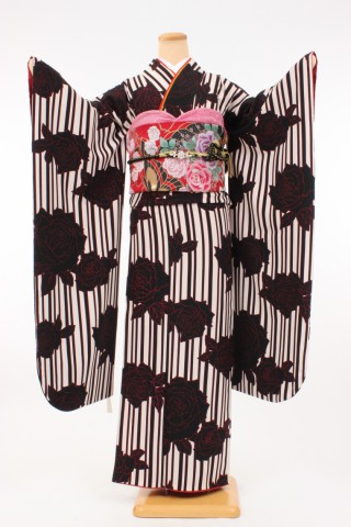 104-M-gaw0017 振袖レンタル Mサイズ 白黒ストライプ/漆黒の薔薇 お客様:Y.M..