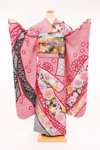 104-M-kaw0097 振袖レンタル Mサイズ 赤/絞り染 熨斗目草花文 お客様:M.O様..