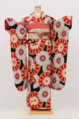 104-M-gaw0130 振袖レンタル Mサイズ 黒地/フラワー/和風館 お客様:N.F様 ..