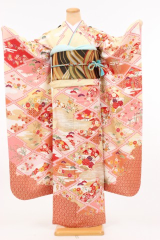 104-L-kaw0216 振袖レンタル Lサイズ クリーム/松葉菱に扇面 お客様:Y.I様 ..