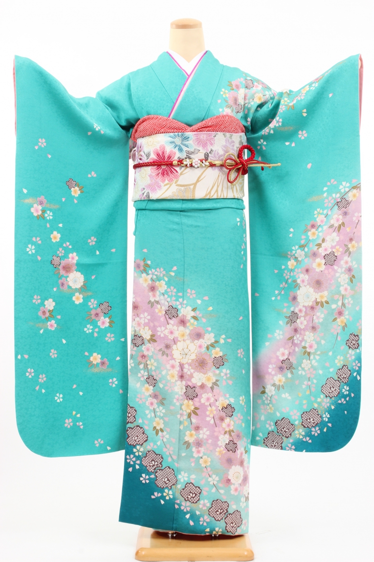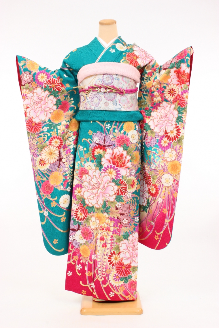 104-S-kaw0036 振袖レンタル Sサイズ 青緑/大乱菊に牡丹 お客様:I.W様 富山県..