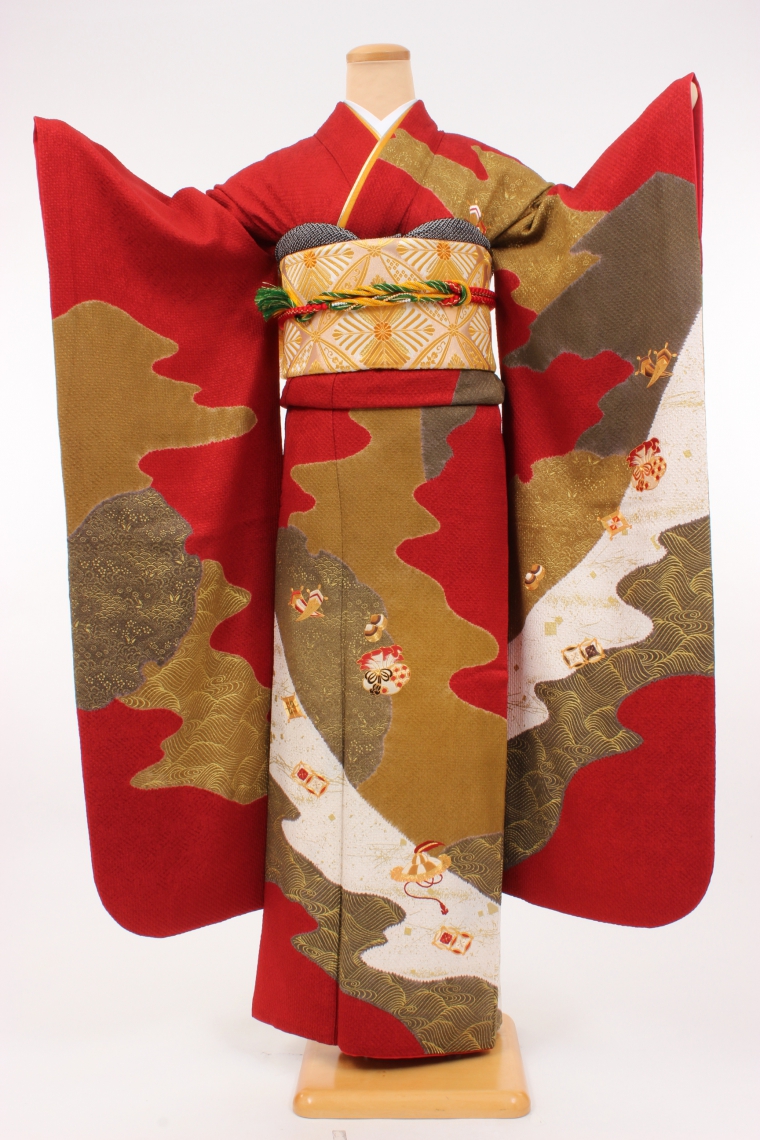 104-L-kaw0041 振袖レンタル Lサイズ 赤絞り染め/刺繍宝尽くし 104-L-kaw..
