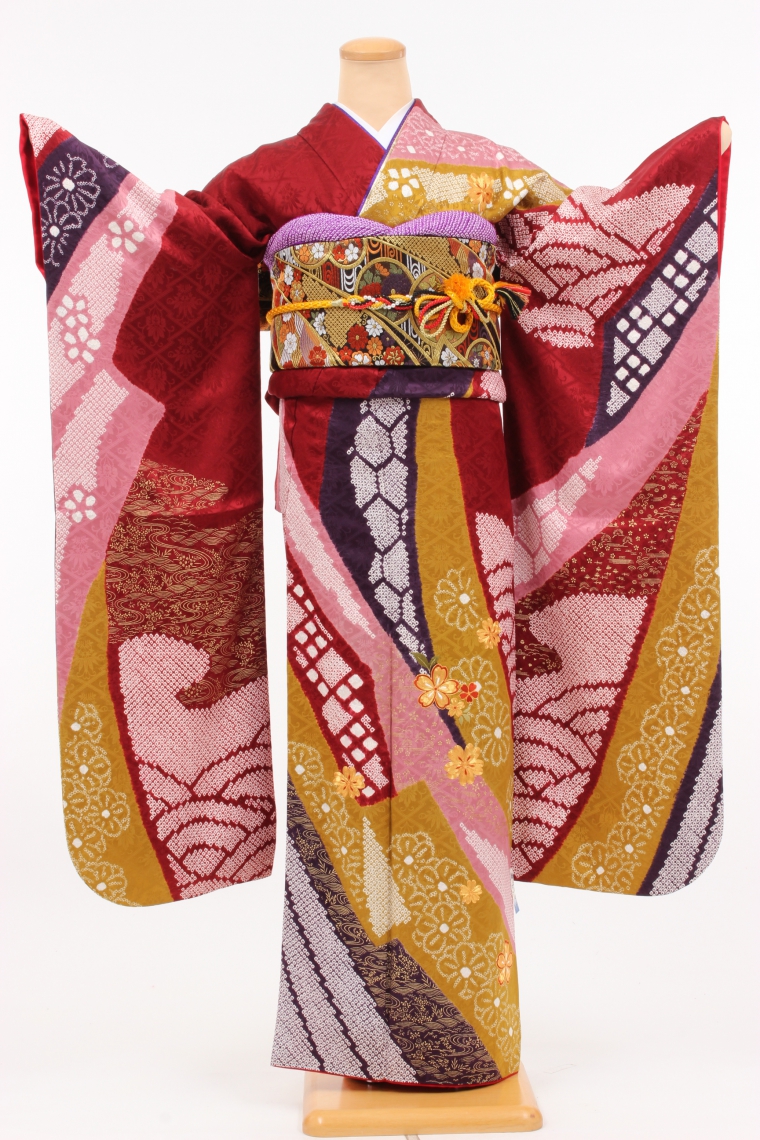 104-S-kaw0018 振袖レンタル Sサイズ 赤/絞り染風 熨斗目文様 お客様:T.M様 ..