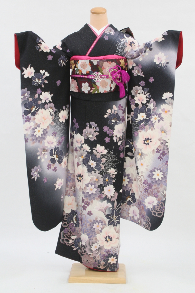 104-L-kaw0096 振袖レンタル Lサイズ 黒/花流し お客様:N.H様 大阪府 10代..