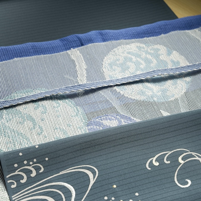 やや渋めと感じるかもしれませんが、波の躍動感に若々しさがあり、そこへきて波つながりの涼し気な帯を合わせることで、大人の遊び心が全面にでます。