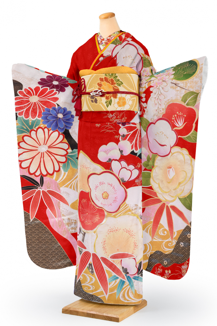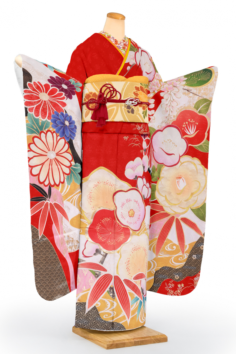 振袖レンタル 振袖LLサイズ メーカー:京都丸紅 大四季花文 真紅色 サイズ:LL 165~175cm 表地:正絹