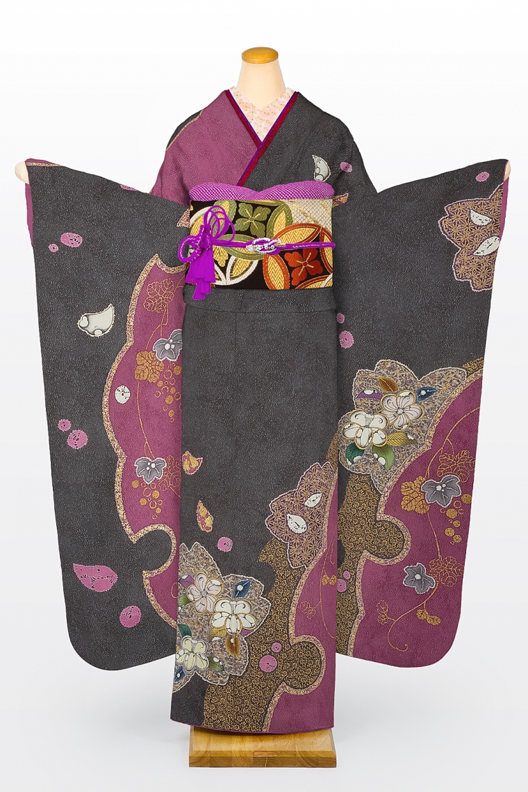 振袖レンタル 振袖Lサイズ 絞り 大雪輪に桜 紫/墨グレー サイズ:L 158~168cm 表地:正絹