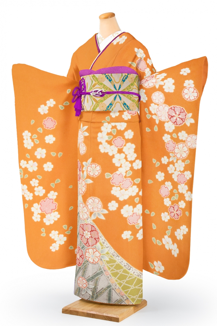 振袖レンタル 振袖Mサイズ 十日町友禅 絞り おぼろ染桜散らし オレンジ サイズ:M 153~160cm 表地:正絹