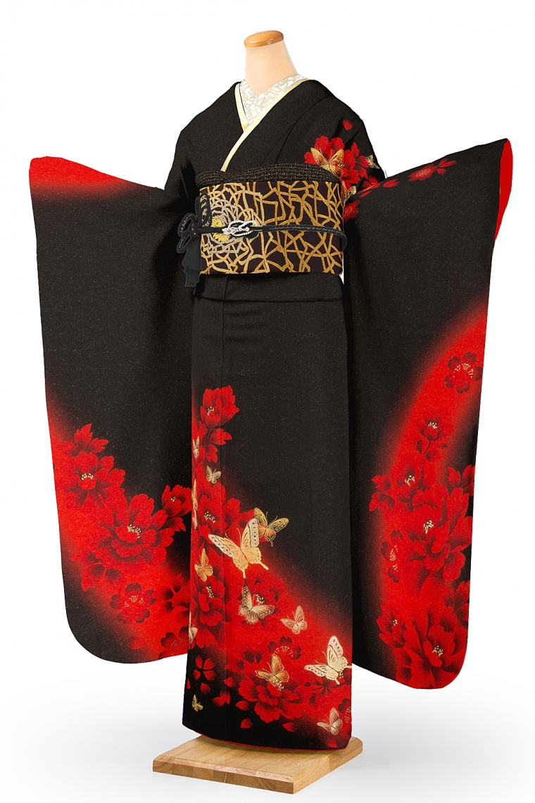 銀糸の織り込まれた生地がきらきらと華やかに演出する、シックな黒地ベースの染めに真っ赤なぼかし染めの加工がされているモダンな振袖。真紅の幻想的な薔薇の周りには金箔で加工され表現されている数羽の蝶が艶やかに、遊んでいるように描かれています。気品と豪華さを合わせ持つモダンな一枚です。