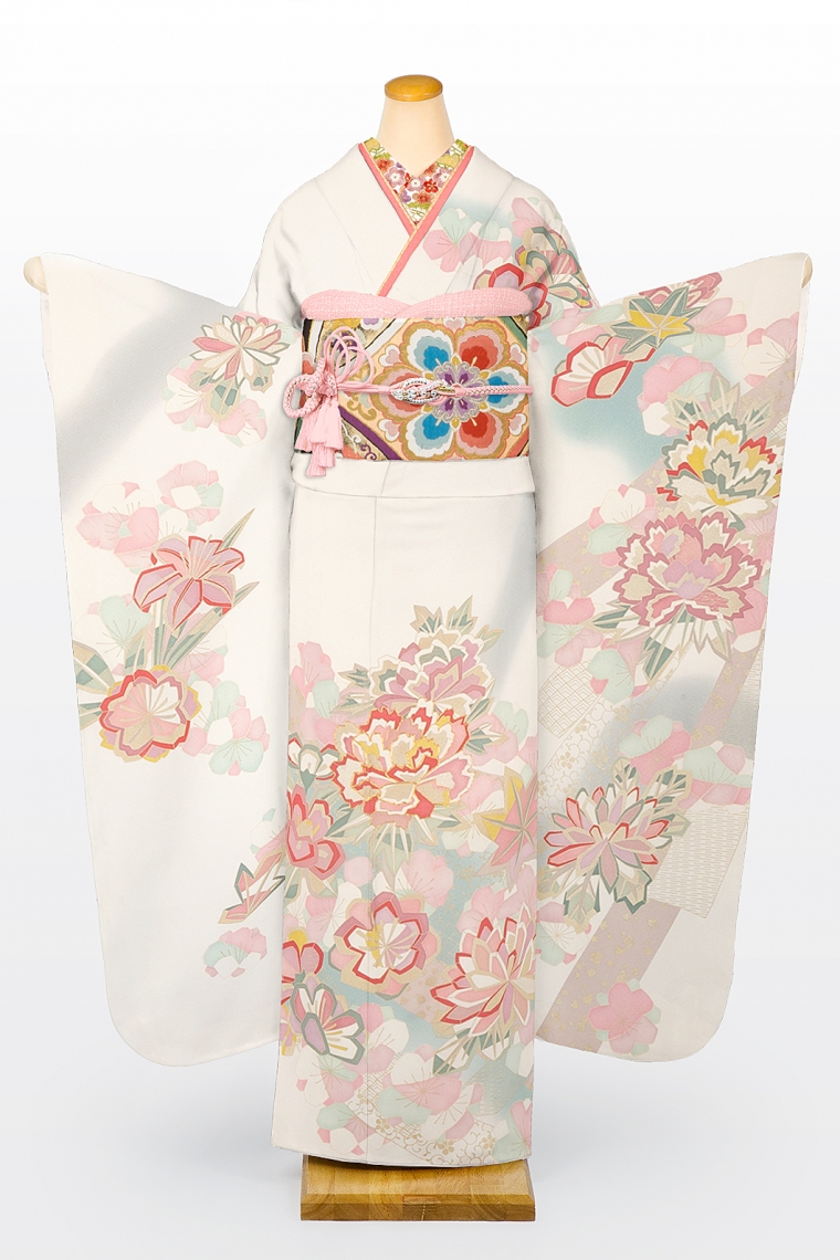 振袖レンタル 振袖Lサイズ 京友禅:切り絵牡丹 白 サイズ:L 158~168cm 表地:正絹