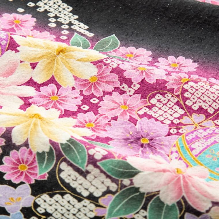 振袖レンタル 振袖LLOサイズ 桜流線 黒/紫ピンク サイズ:LL-O 165~175cm ゆったりサイズ 表地:正絹
