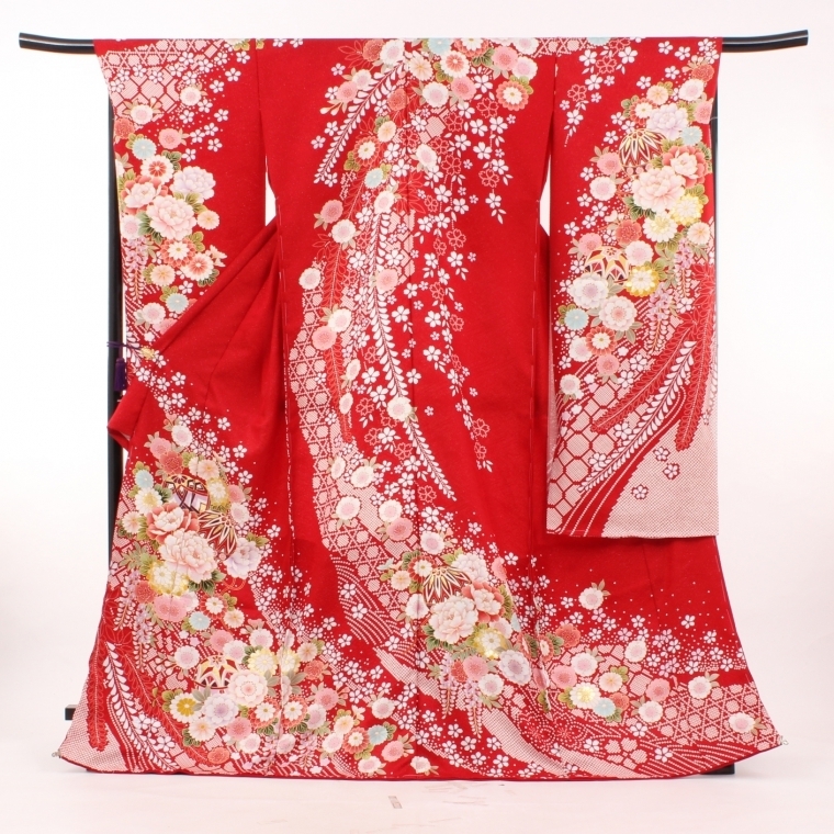 振袖レンタル 振袖Mサイズ 鞠に草花文様 赤 サイズ:M 153~160cm 表地:正絹