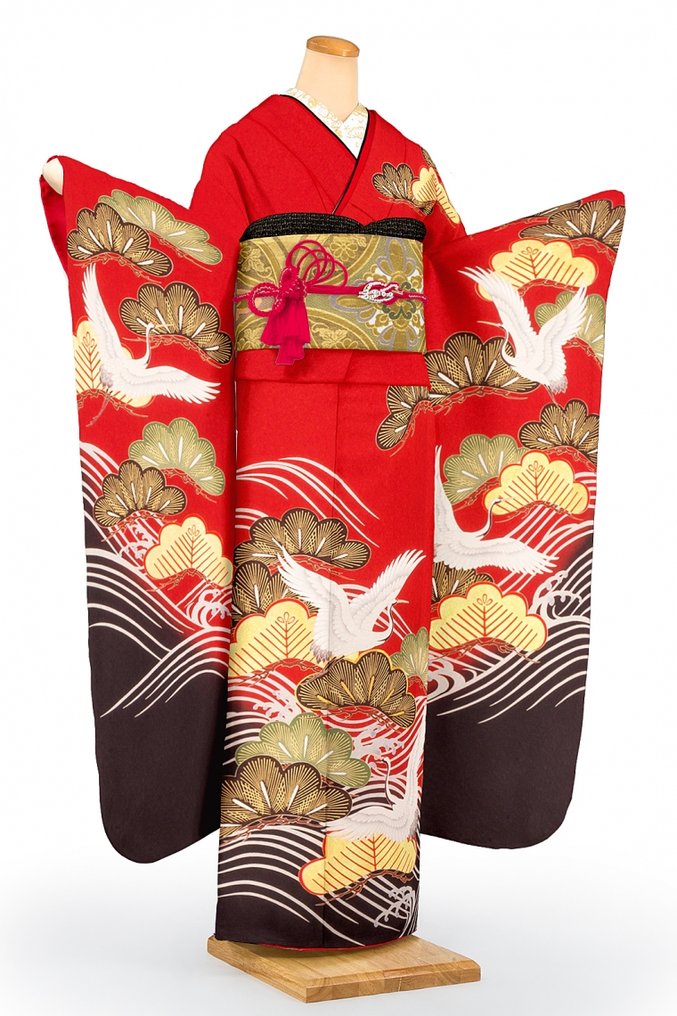 振袖レンタル 振袖LLサイズ ブランド:OshimaUco 波に鶴松 赤 サイズ:LL 165~175cm 表地:正絹