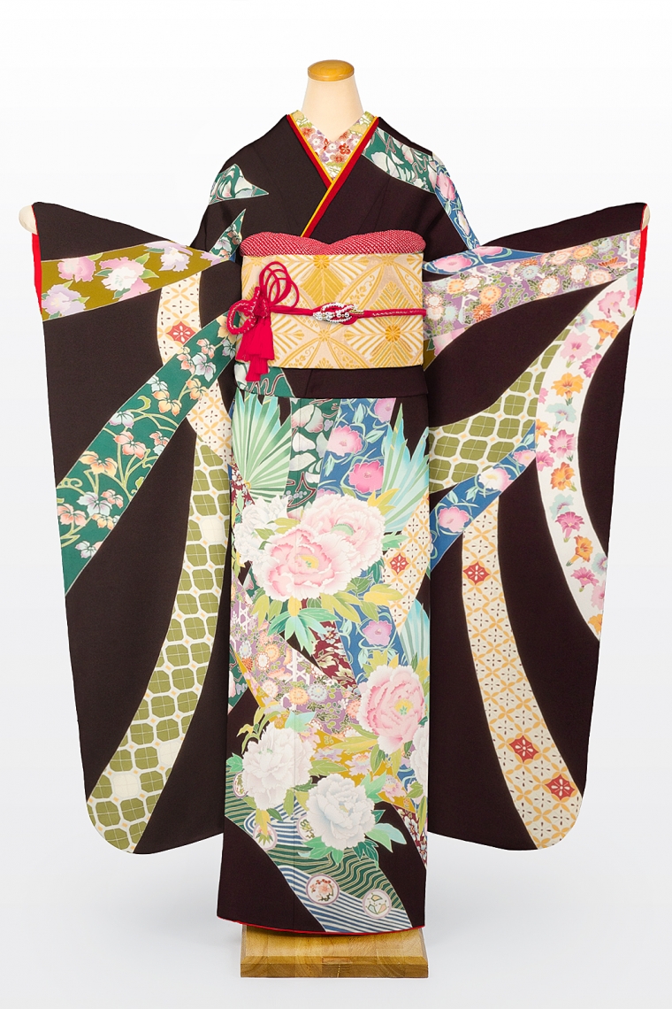 振袖レンタル 振袖Lサイズ 加賀友禅:奥田勝将 束ね熨斗に牡丹 黒 サイズ:L 158~168cm 表地:正絹