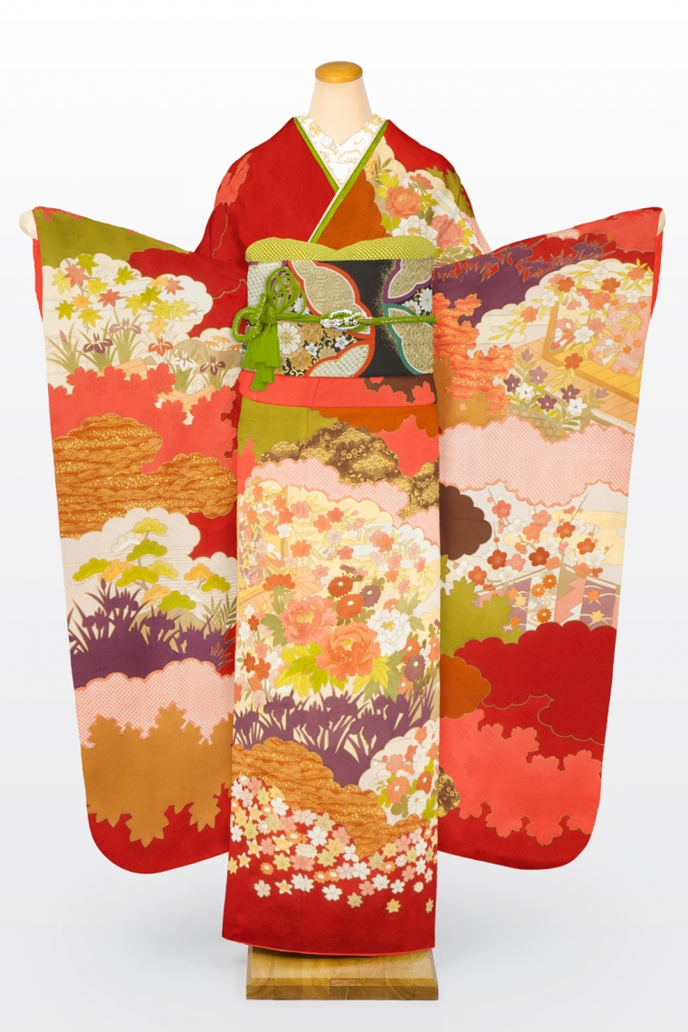 振袖レンタル 振袖Sサイズ 京友禅:藤井寛 雲取四季草花文 朱赤 サイズ:S 148~155cm 表地:正絹