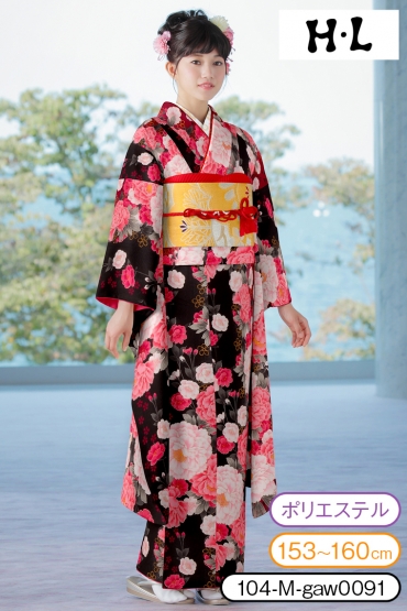 振袖レンタル 振袖Mサイズ ブランド:H・L(アッシュエル)キュートな花模様 黒/ピンク サイズ:M 153~160cm 表地:合繊