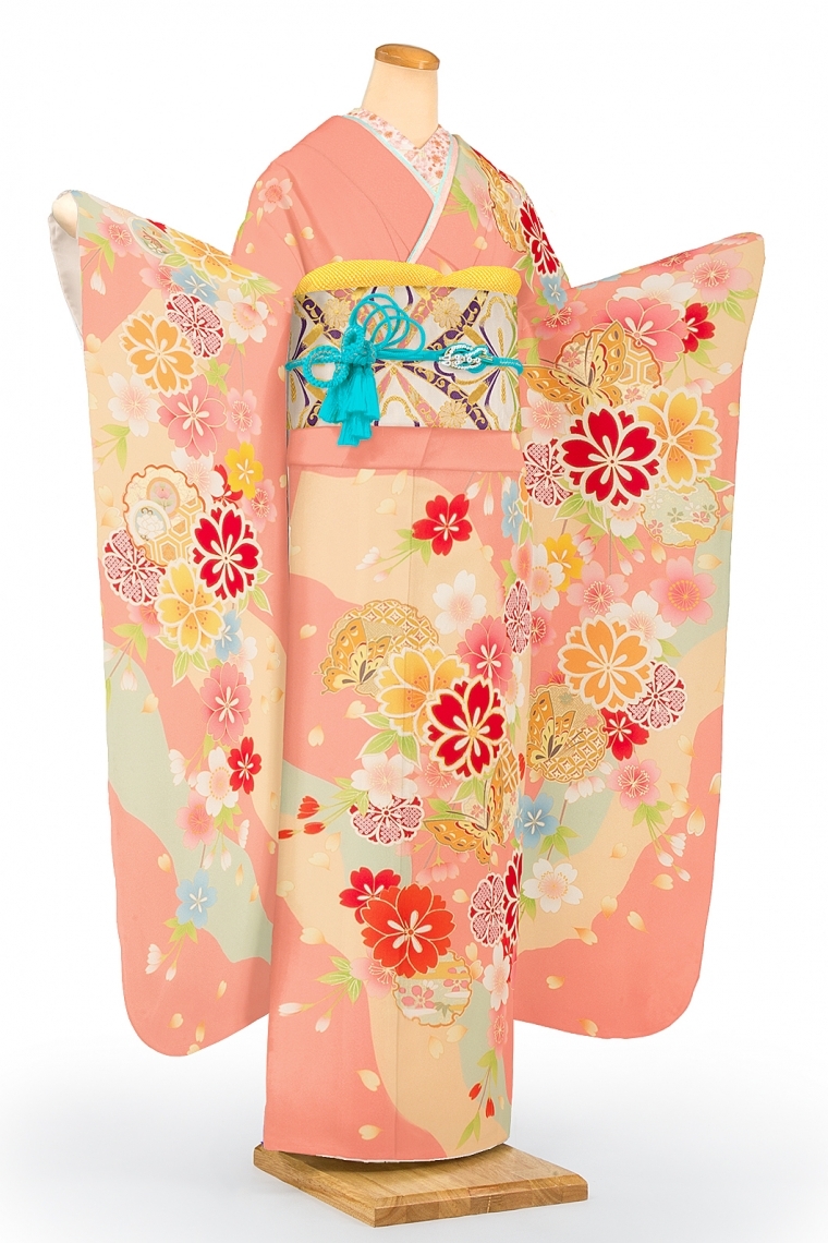 振袖レンタル 振袖Lサイズ 蝶々に雪輪桜 サーモンピンク サイズ:L 158~168cm 表地:正絹