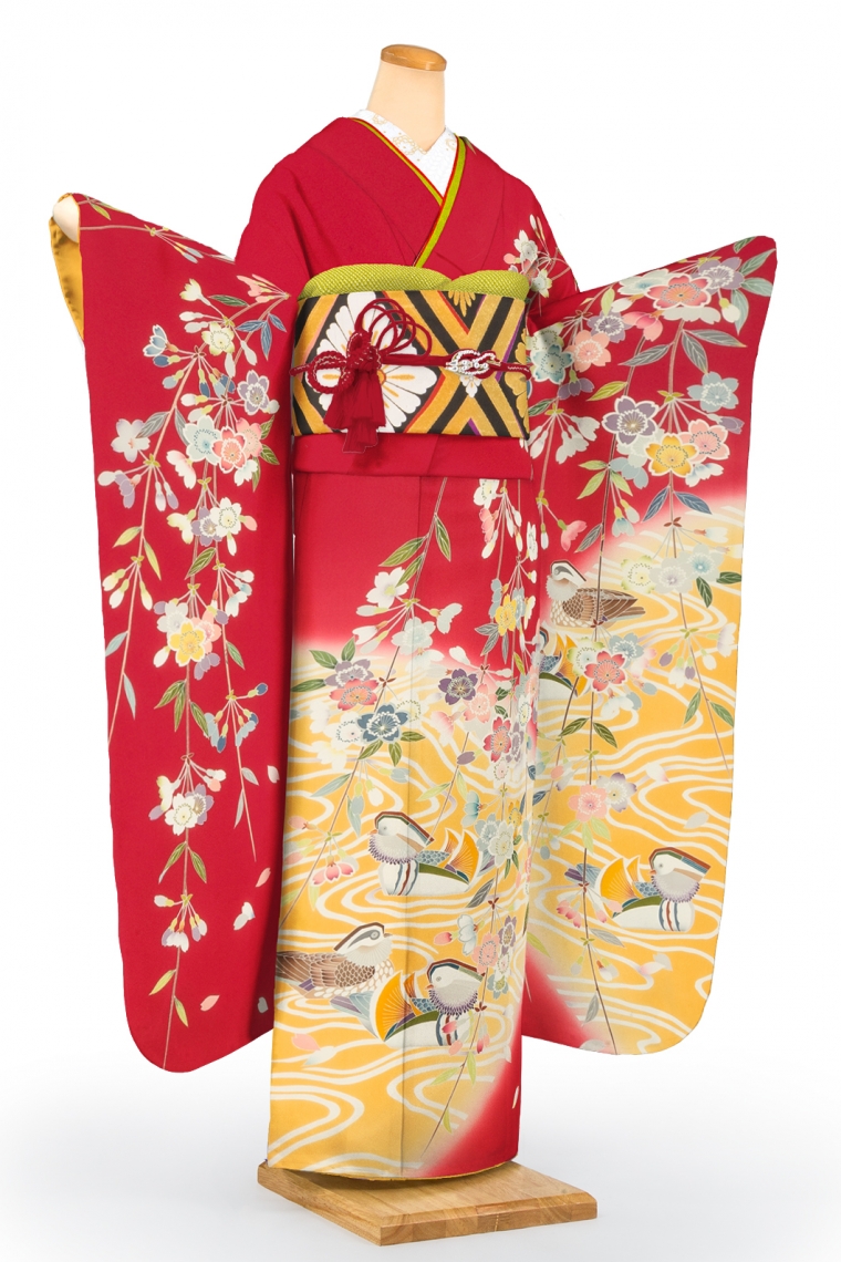 振袖レンタル 振袖Lサイズ 鴛鴦 赤 サイズ:L 158~168cm 表地:正絹