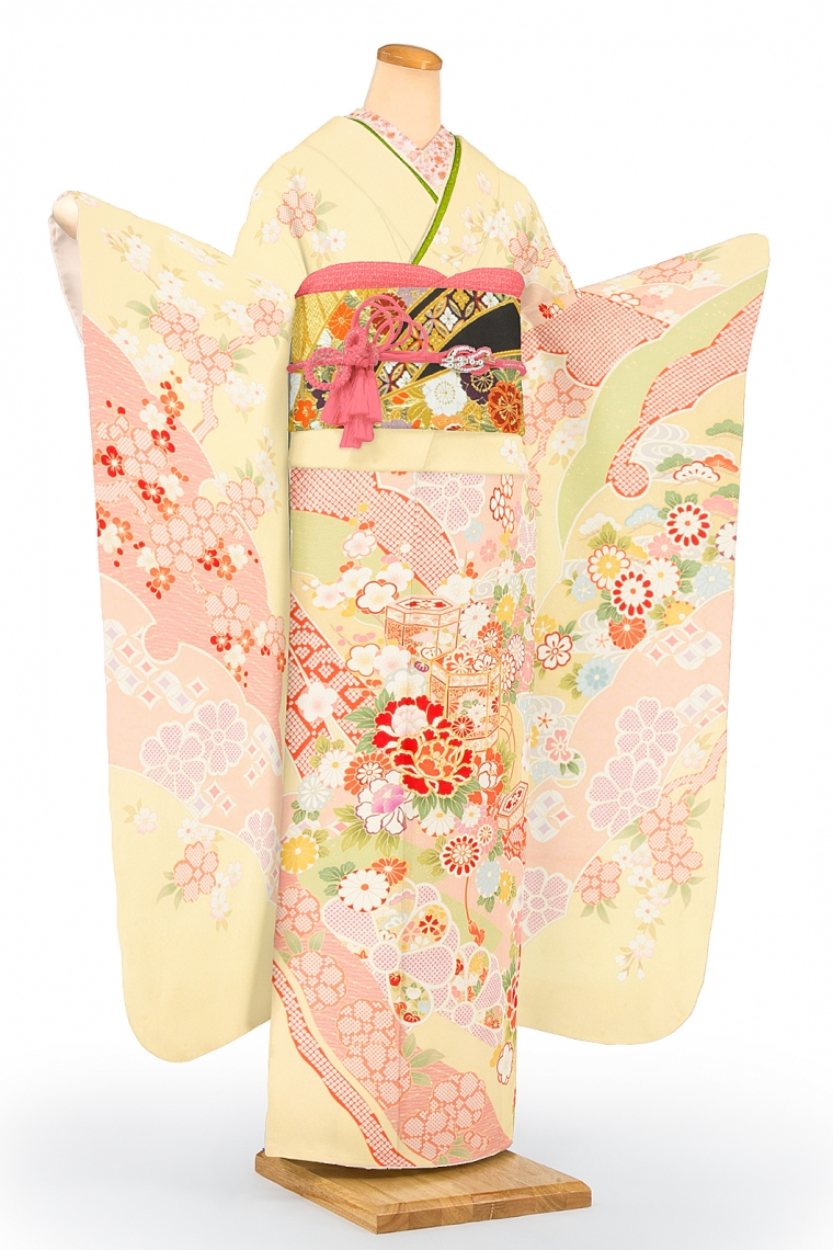 振袖レンタル 振袖Lサイズ 雪輪に四季花 クリーム サイズ:L 158~168cm 表地:正絹