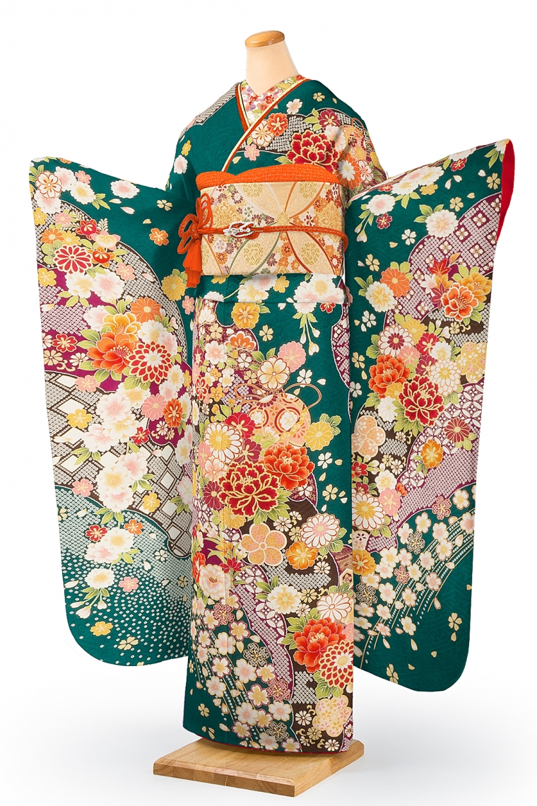 振袖レンタル 振袖Lサイズ 雪輪に四季花 緑 サイズ:L 158~168cm 表地:正絹