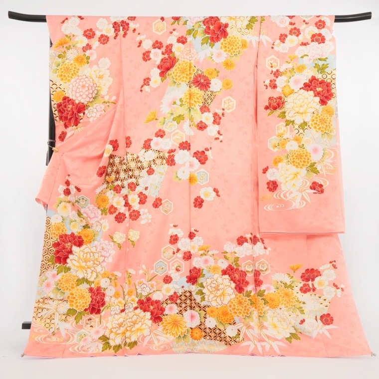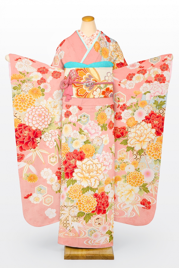 振袖レンタル 振袖Lサイズ 流水に牡丹菊図 ピンク サイズ:L 158~168cm 表地:正絹