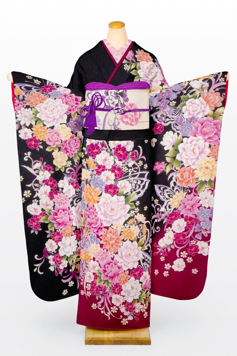 振袖レンタル 振袖LOサイズ 洋花蝶文 黒 サイズ:L-O 158~168cm ゆったりサイズ 表地:正絹
